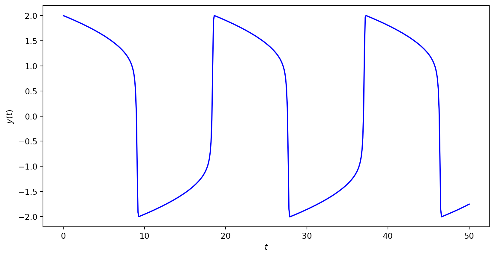 \[ \begin{align*} \dot{y}_1 &= y_2, \\ \dot{y}_2 &= 10 (1 - y_1^2) y_2 - y_1, \end{align*} \]