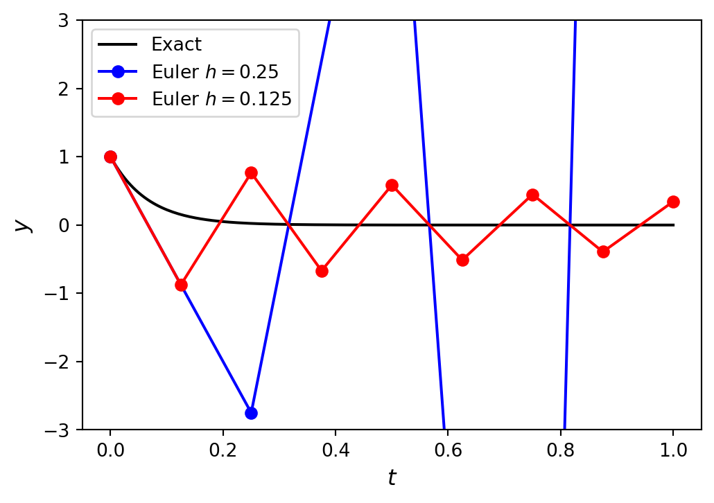We saw earlier that solving the ODE \(y' = -15y\) using \(h=0.25\) resulted in an unstable solution, since \(\lambda = -15\) then