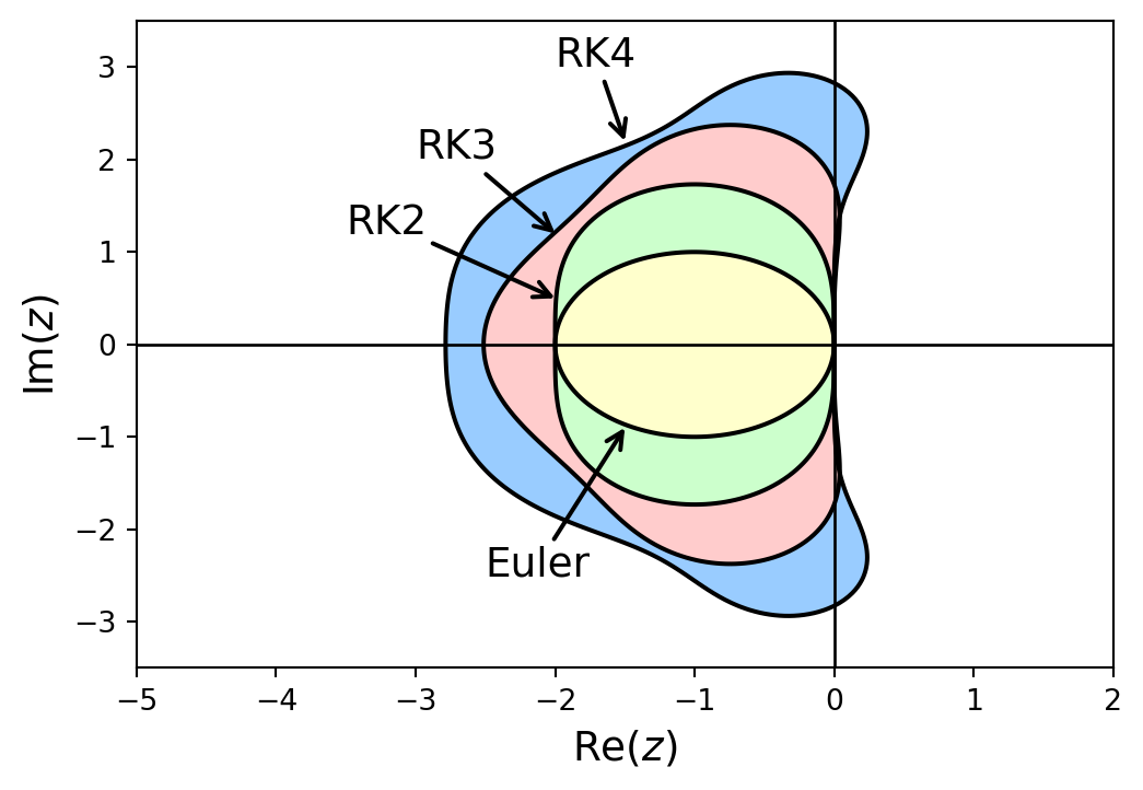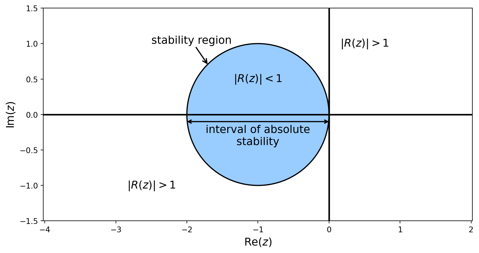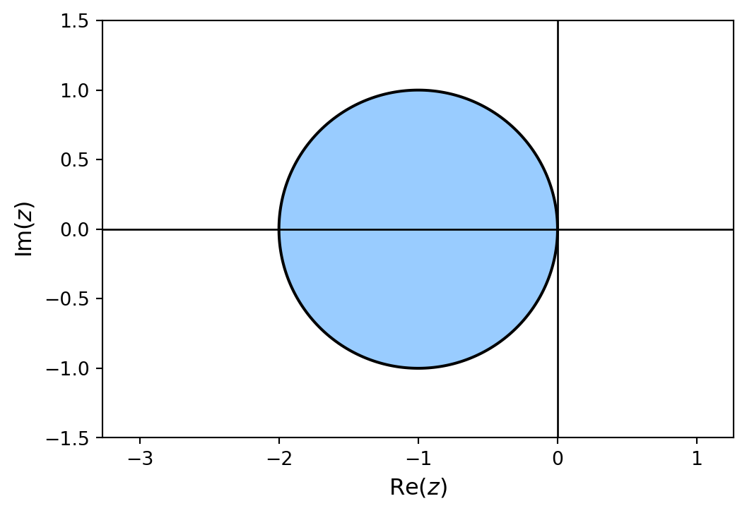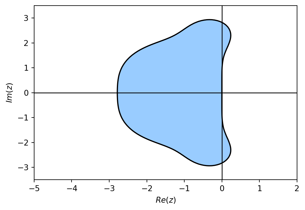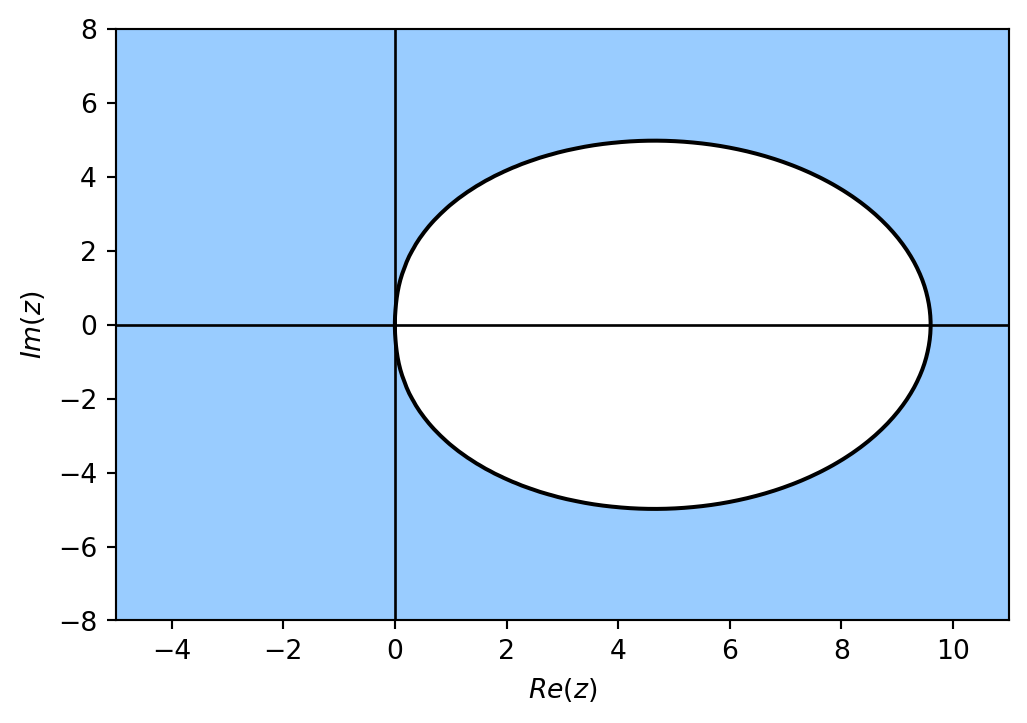 ylabel("$\mathrm{Im}(z)$", FontSize=12, Interpreter="latex")The range values of the step length that can be chosen is governed by the stability region and provides use with the following definition.