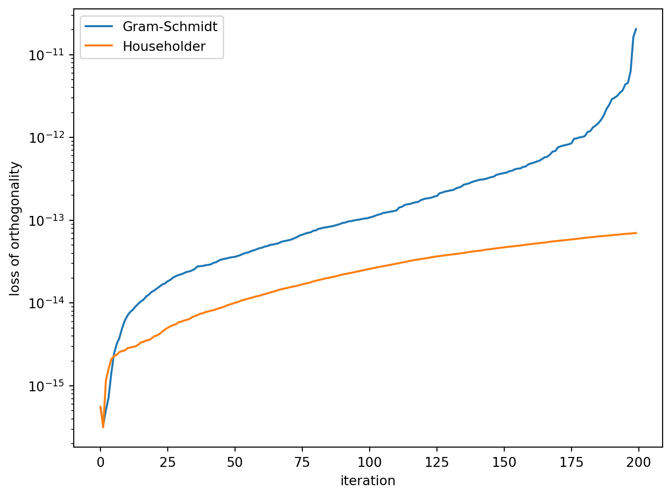 To analyse the methods, the QR decomposition of a random \(200 \times 200\) matrix \(A\) was computed using the Gram-Schmidt process and Householder reflections.