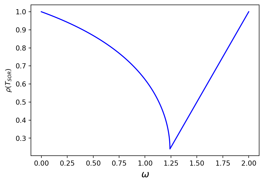 The plot below is of \(\rho(T_{SOR})\) against \(\omega\) for the linear system solved in the preview examples.