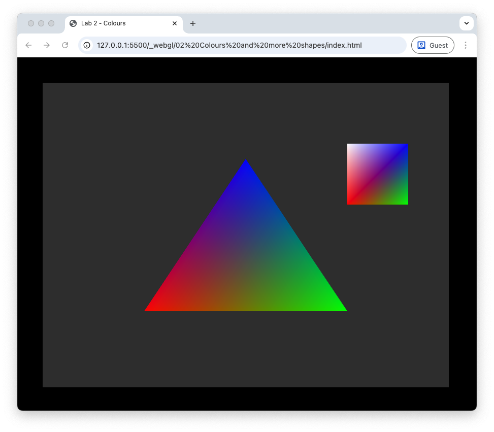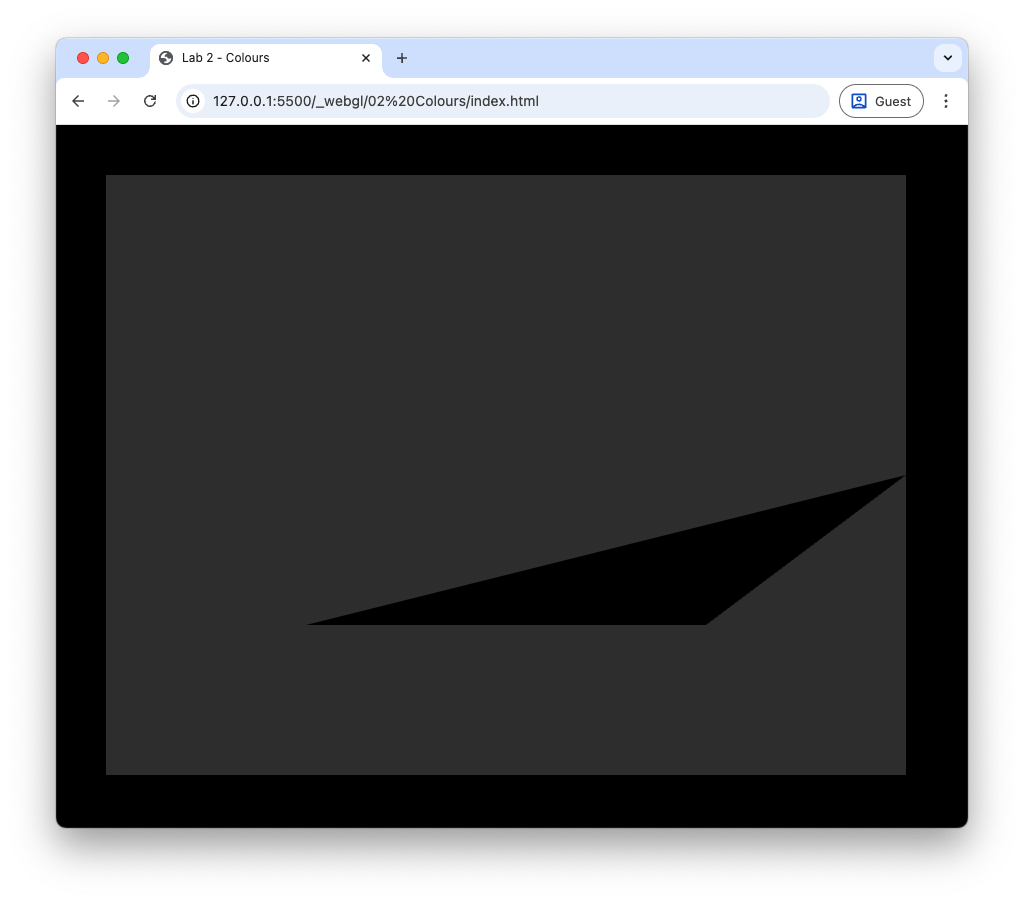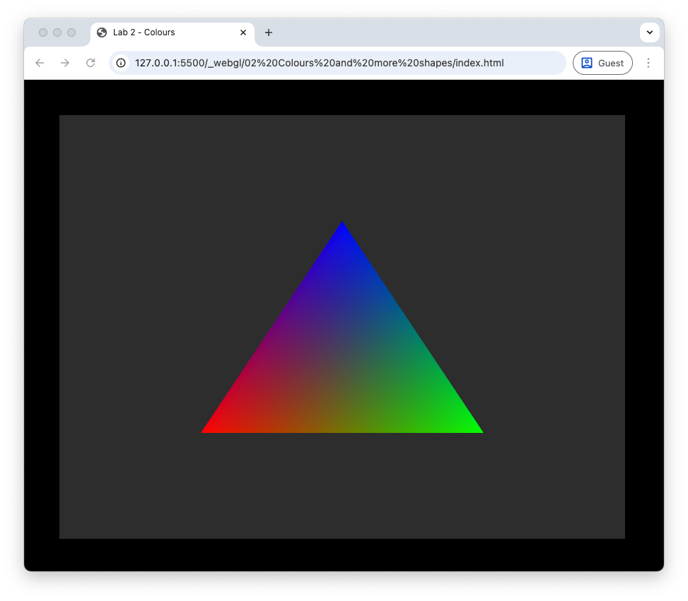 Create a folder called 02 Colours and download index.html, colours.js and webGLUtils.js to it. Open index.html in a web browser to check that the red triangle from Lab 1 is displayed.