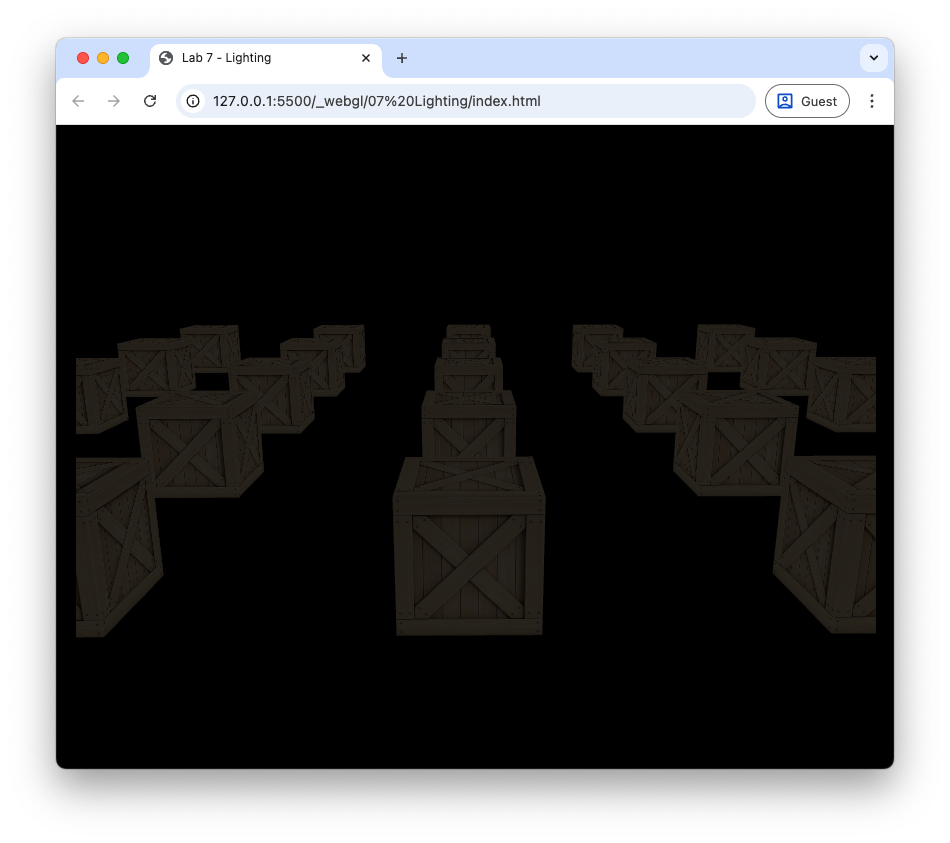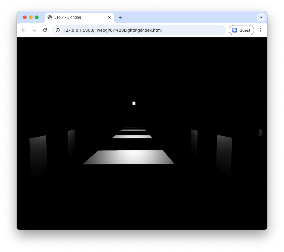 Create a copy of your 06 Moving the Camera folder, rename it 07 Lighting, rename the file moving_the_camera.js to lighting.js and change index.html so that the page title is “Lab 7 - Lighting” it uses lighting.js.