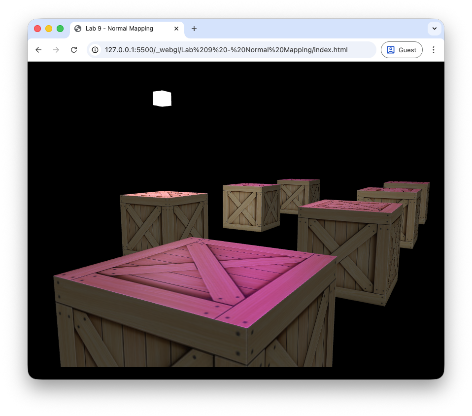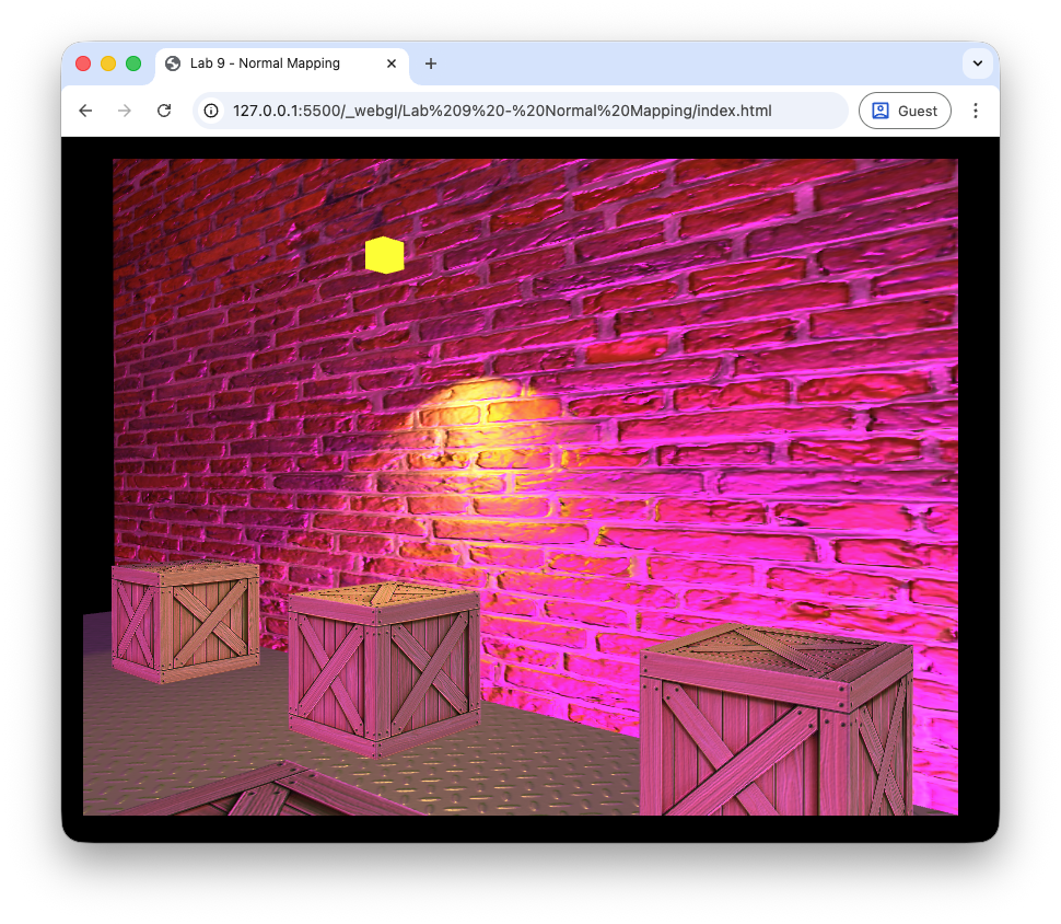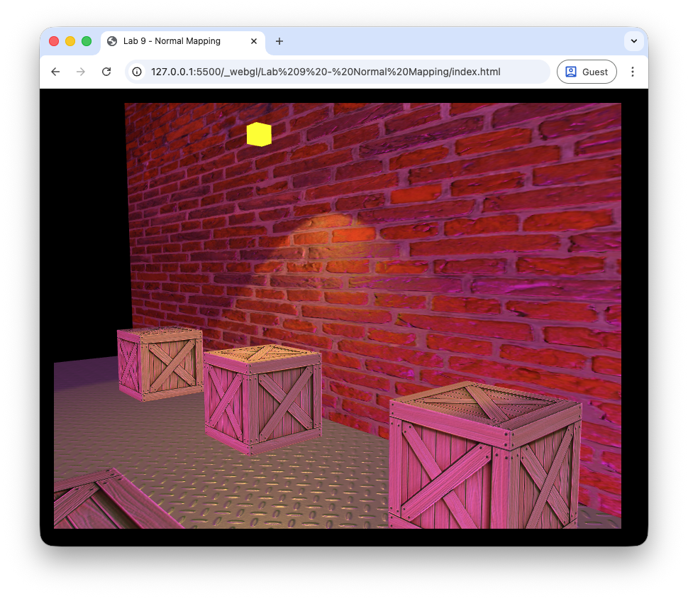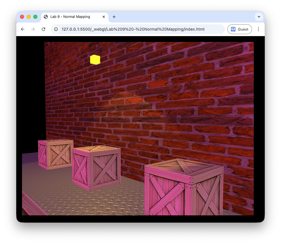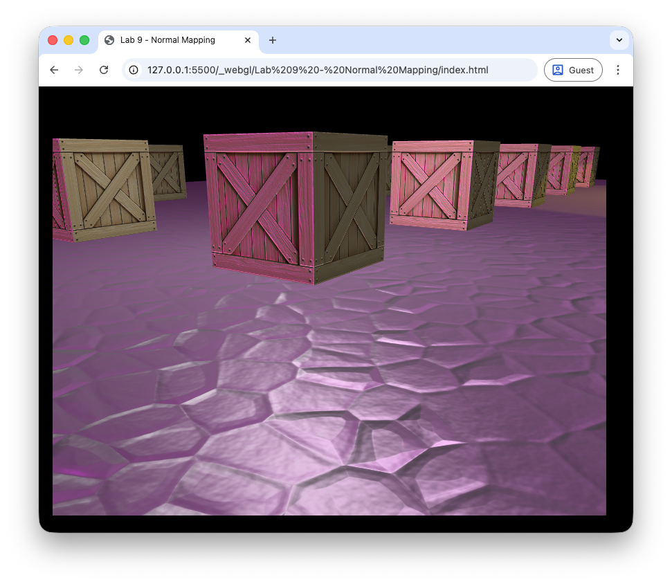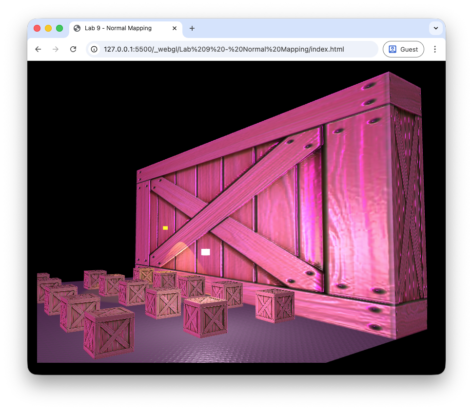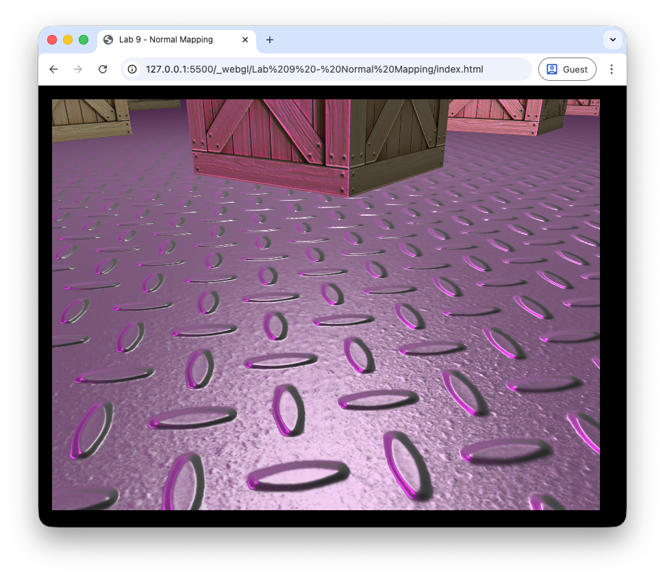 Create a copy of your Lab 8 Lighting folder, rename it Lab 9 Normal Mapping, rename the file lighting.js to normal_mapping.js and change index.html so that the page title is “Lab 9 - Normal Maps” it embeds normal_mapping.js.